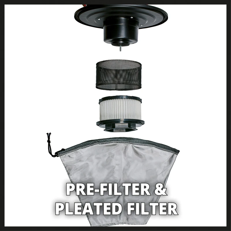 Dankzij de plooifilter maken fijnstof en asstof geen kans. Het extra voorfilter zorgt voor een nog betere filtering en voorkomt een snelle verstopping van de plooifilter. Het reservoir kan gemakkelijk worden geleegd dankzij de snelsluitingen. De stroomkabel wordt eenvoudig en praktisch opgeborgen dankzij de kabelbinder met klittenband. Ook kan gebruik worden gemaakt van de blaasfunctie door de slang op de luchtuitlaat aan te sluiten. De levering omvat een met metaal versterkte zuigslang en de aluminium zuigbuis.