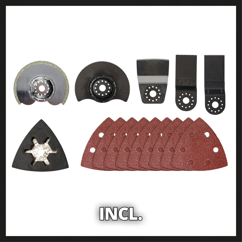 Doordat deze multitool op accu werkt heb je veel meer bewegingsvrijheid. Om snel van opzetstuk te kunnen wisselen, is de multitool voorzien van een quick-releasefunctie met magnetische gereedschapshouder. Deze functie maakt het gebruik van extern gereedschap voor het wisselen van opzetstuk overbodig. De 12-pins gereedschapshouder maakt een flexibele plaatsing van de accessoires mogelijk. Bij de machine worden standaard een schraapmes, een invalzaagblad voor hout en kunststof (HCS), een BIM invalzaagblad voor metaal (HSS), een BIM zaagblad voor hout, kunststof en metaal (HSS) meegeleverd. Zo kun je direct aan de slag. Voor een optimaal comfort bij de bediening van de multitool is deze voorzien van een soft-grip handgreep aan de achterzijde. De soft-grip handgreep absorbeert een groot deel van de vrijgekomen trillingen, waardoor vermoeidheidsverschijnselen voorkomen worden.