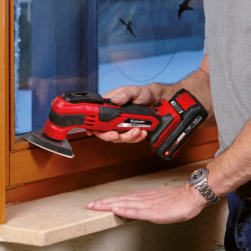 De Einhell VARRITO / TE-MG 18 Li Solo Accu Multitool kan voor verschillende klussen in en rondom je woning gebruikt worden. Dankzij het lichte gewicht en compacte formaat van deze multitool is de machine erg comfortabel in zijn gebruik. Een instelbare elektronische toerenregelaar maakt het mogelijk om de snelheid van de machine naadloos aan te laten sluiten bij de uit te voeren werkzaamheden (zagen, slijpen of schrapen) en het gebruikte materiaal. De multitool is onderdeel van de Power-X-Change productlijn. De machine levert een onbelast toerental van 11.000 tot 20.000 toeren per minuut. Dit zorgt ervoor dat er 22.000 – 40.000 trillingen worden bereikt. Dankzij de geïntegreerde elektronische toerenregelaar bepaal je zelf op welk toerental de machine draait bij het uitvoeren van werkzaamheden. Doordat de machine een constante snelheid aanhoudt, wordt een optimaal resultaat behaald. Bij deze multitool heb je geen last meer van eenlastige stroomkabel. Ook ben je niet meer afhankelijk van een verlengsnoer om lastig bereikbare plaatsen te bereiken.