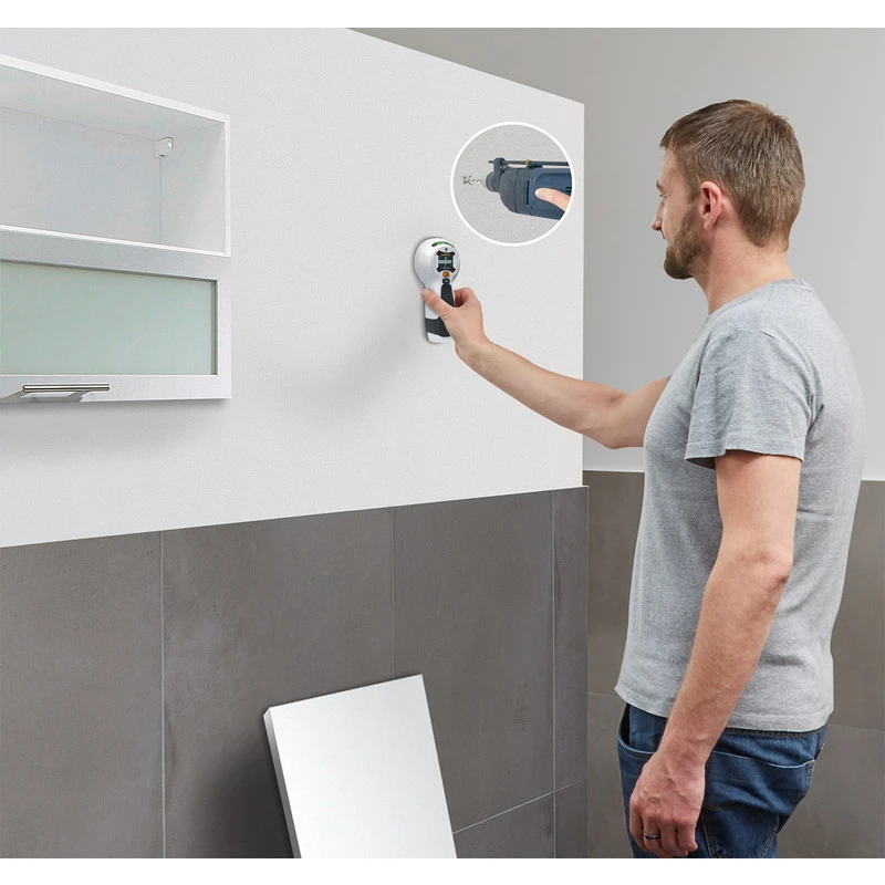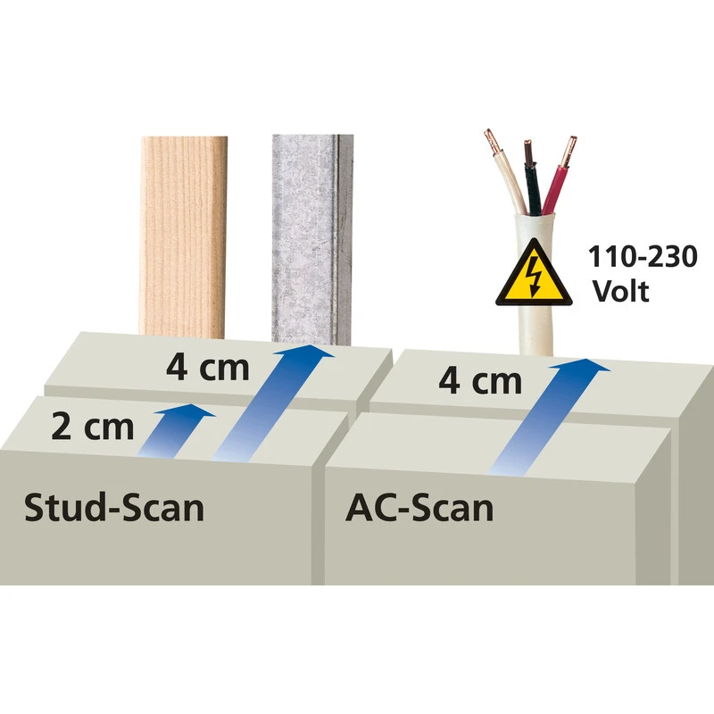 • De elektronische scanner herkent spanningvoerende leidingen evenals wand- en dwarsbalken in de droogbouw