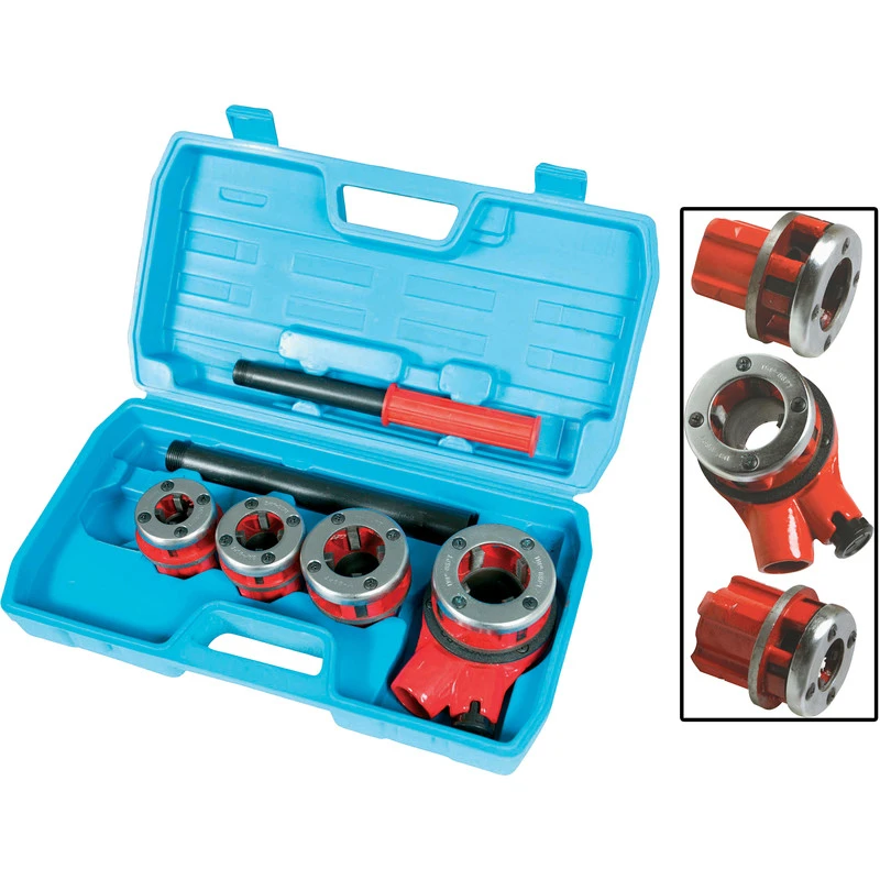 • Gietijzeren snijkoppen met vier gehard stalen beitels per kop voor het snijden van een scherp en nauwkeurig schroefdraad, met vier spaanafvoeropeningen per kop
