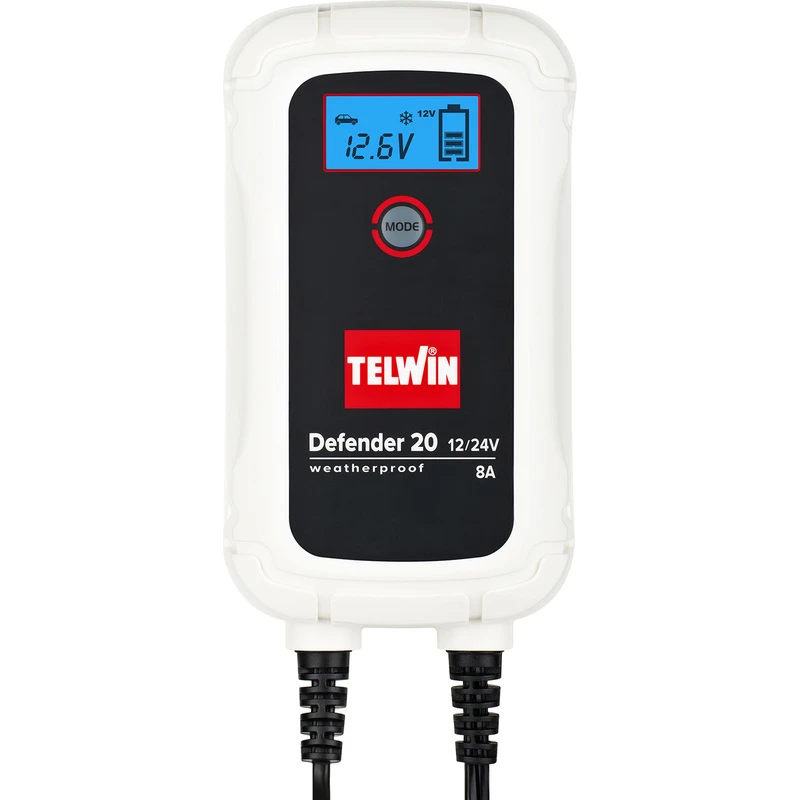 • De Telwin Defender 20 is een intelligente druppellader met elektronische regeling van de laadstroom, automatische onderbreking en herstart (PULSE-TRONIC) voor 12 en 24V accu’s. De Defender 20 heeft ook een Cold functie voor veilig en gecontroleerd laden bij lagere temperaturen. Toepassingen zijn o.a. motor, auto, bestelwagen, boot.