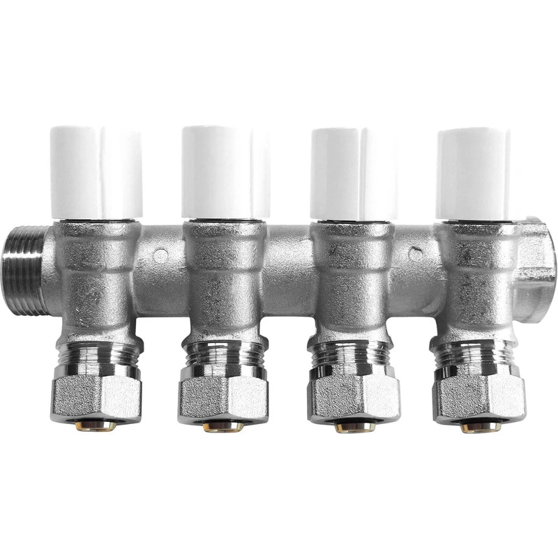 Uit warm geperst messing met 4 aftakkingen M22, asafstand = 35 mm. Afsluitkraantjes met colour disks (apart meegeleverd) en met voorgemonteerde 16mm knelkoppelingen voor rechtstreekse aansluiting van meerlagenbuizen. Toepassing in sanitair, verwarming met radiatoren en vloerverwarming.